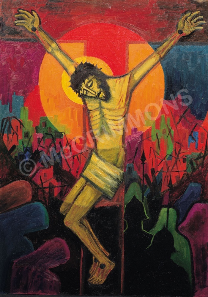 The image of the risen Lord in station 16 shatters the overwhelming feeling of darkness and doom with its vivacious display of colour, sympathetic with the immense joy of the resurrection. Christ is risen!
