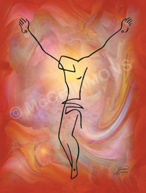 His unusual style of combining simple black line art imagery, against colourful contrasting backgrounds, make a powerful and striking statement that are ideally suited as display banners around the church or school.