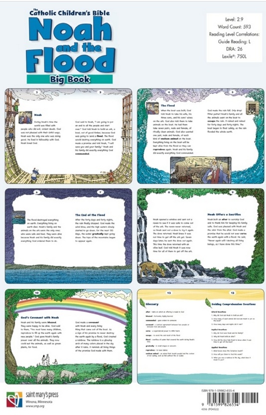 • Noah and the Flood Big Book, measuring 14 in. x 21 in., is designed to be easy to read and hold in front of a group of children