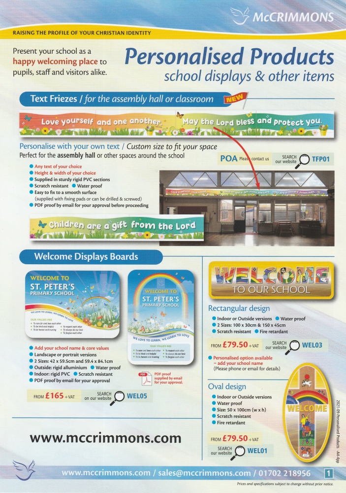 A range of our Personalised products including Prayer Cards, School House Banners and Welcome Boards.