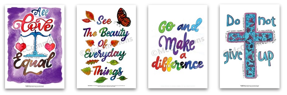 A set of 10 posters taken from Clare Campbell’s extensive collection of artwork (Be the ChangeBlack Lives MatterInspirational Word ArtLove Scripture and What is Beauty?)