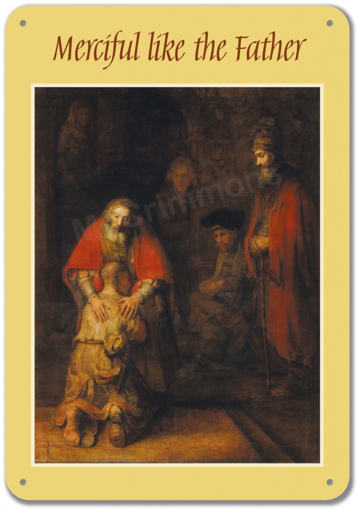 The text chosen by Pope Francis as the motto for the Jubilee Year of Mercy: "Merciful like the Father" (Luke 6:36) has been combined with Rembrandt's magnificent painting of the errant son returning to his forgiving father to produce this wonderful banner which will grace any church or school.