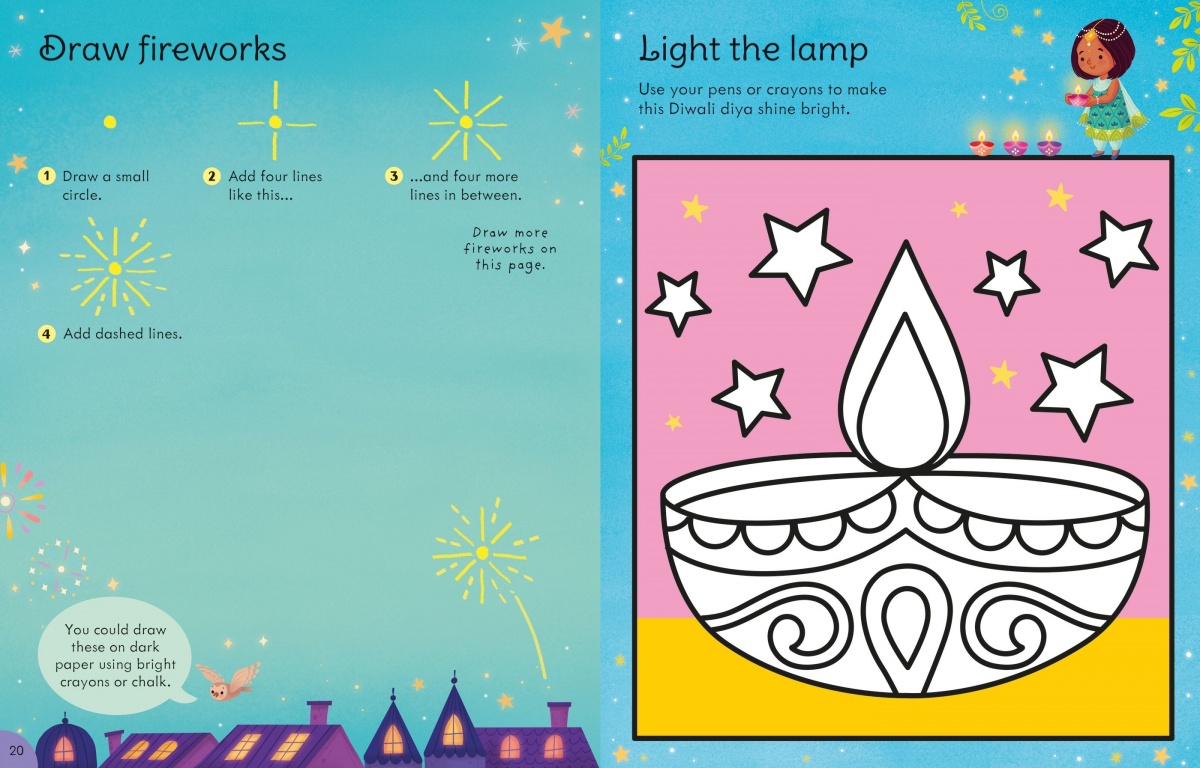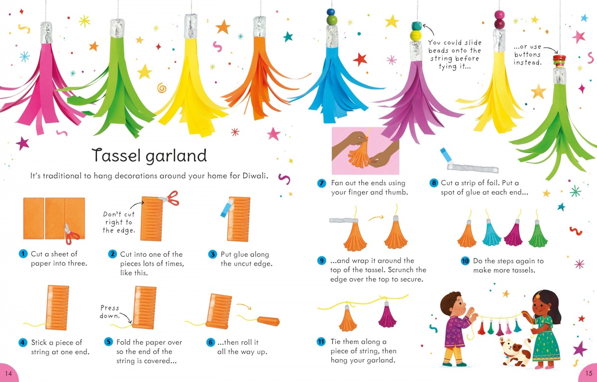 There are all kinds of ideas for decorations to make, from rangoli patterns and lanterns to gift bags and garlands, as well as drawing and colouring activities. All the ideas can be made using everyday household materials, and have clear, illustrated step-by-step instructions, with top tips and photos of the finished crafts.
