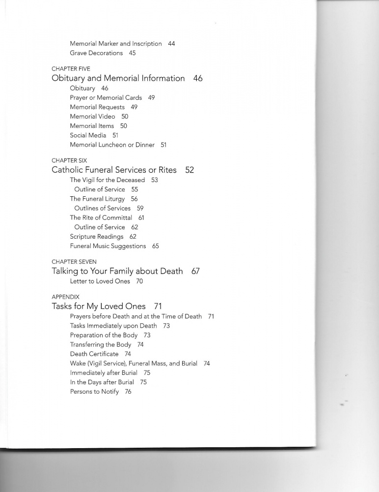 Preparing ahead of time will let them grieve without worrying whether they are fulfilling your wishes, and it may prevent conflict among family members. This booklet is a hopeful, prayerful, and practical guide that will help you record your wishes for the end of your life and funeral. It provides space for recording information regarding DNRs, living wills, and finances. It will guide you through the consumer information for funerals, while also providing theological reflections on the Catholic funeral liturgy, so you can select the Scripture readings and music you would like to be offered at your own funeral. This booklet is grounded in Catholic teaching and will help you make arrangements that reflect your faith in Christ.