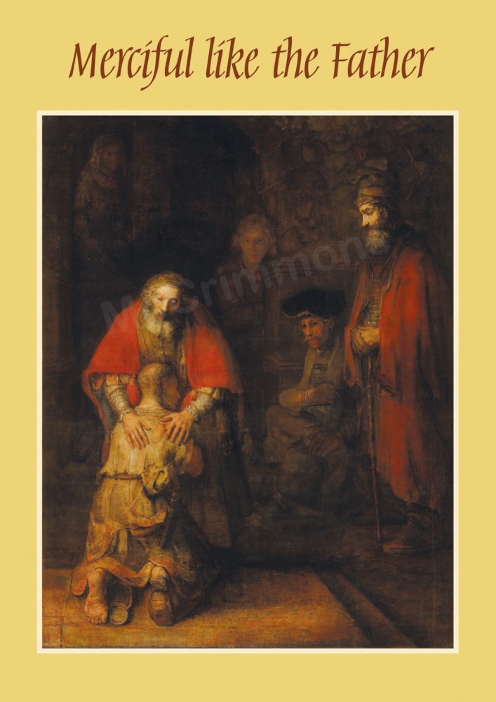 The text chosen by Pope Francis as the motto for the Jubilee Year of Mercy: "Merciful like the Father" (Luke 6:36) has been combined with Rembrandt's magnificent painting of the errant son returning to his forgiving father to produce this wonderful banner which will grace any church or school.