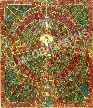 The labyrinth engages the pilgrim in a passage that starts from an entrance and takes them to the centre - but not at once. There are many turnings towards and away from the centre but that we will get there is not in doubt, if only we persevere. A map is printed on the reverse which gives Scriptural references. By following the map and reading the text the labyrinth can be traversed in a prayerful way.