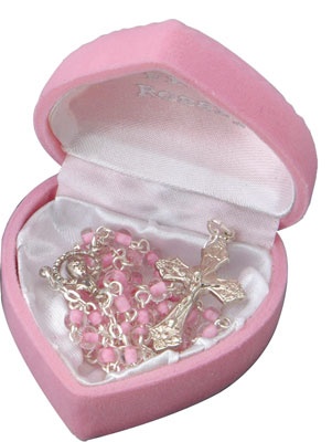 Heart-shaped box has "My First Rosary" inside lid, suitable for a Baptism or Christening gift or for a new baby.