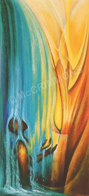 This coming of the Holy Spirit in light is symbolised by the lighted candle handed to each newly baptised person. In this banner the golden light of love and flame is flowing right into the heart of the one being baptised, there to burn and grow.