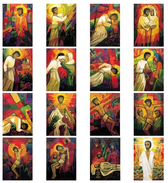 Sixteen Stations of the Cross. These inspired illustrations of Christ's journey to the cross and beyond are presented to us through colour and symbol.